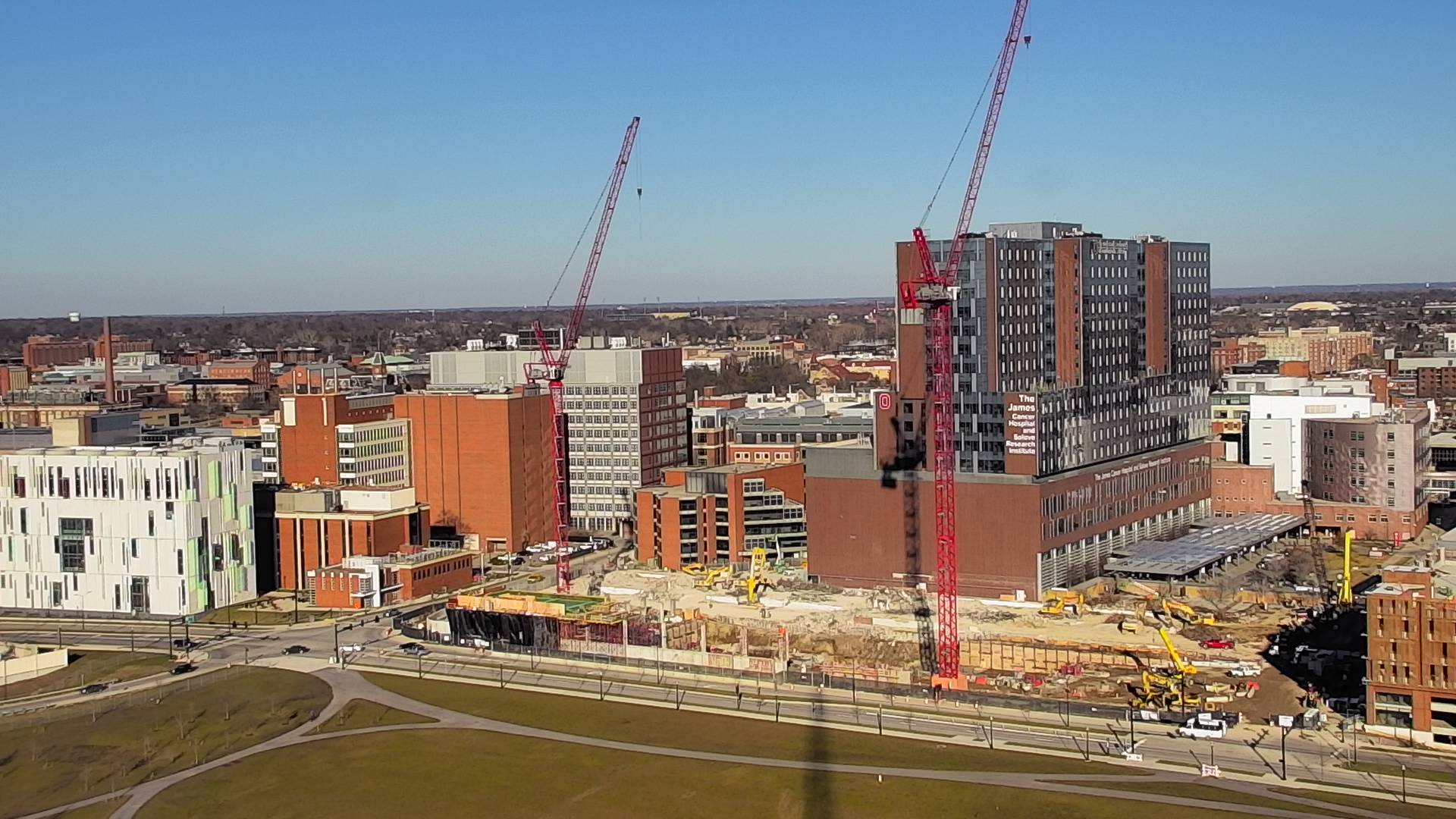 Demolition of the above ground portion of the North and South Cannon Garages was completed in early March 2021. The new Inpatient Hospital foundation work continues upward, with the first structural deck concrete pour occurring March 4. Construction on the 1.9 million-square-feet hospital began in fall 2020 and is the largest single facilities project ever undertaken at Ohio State.