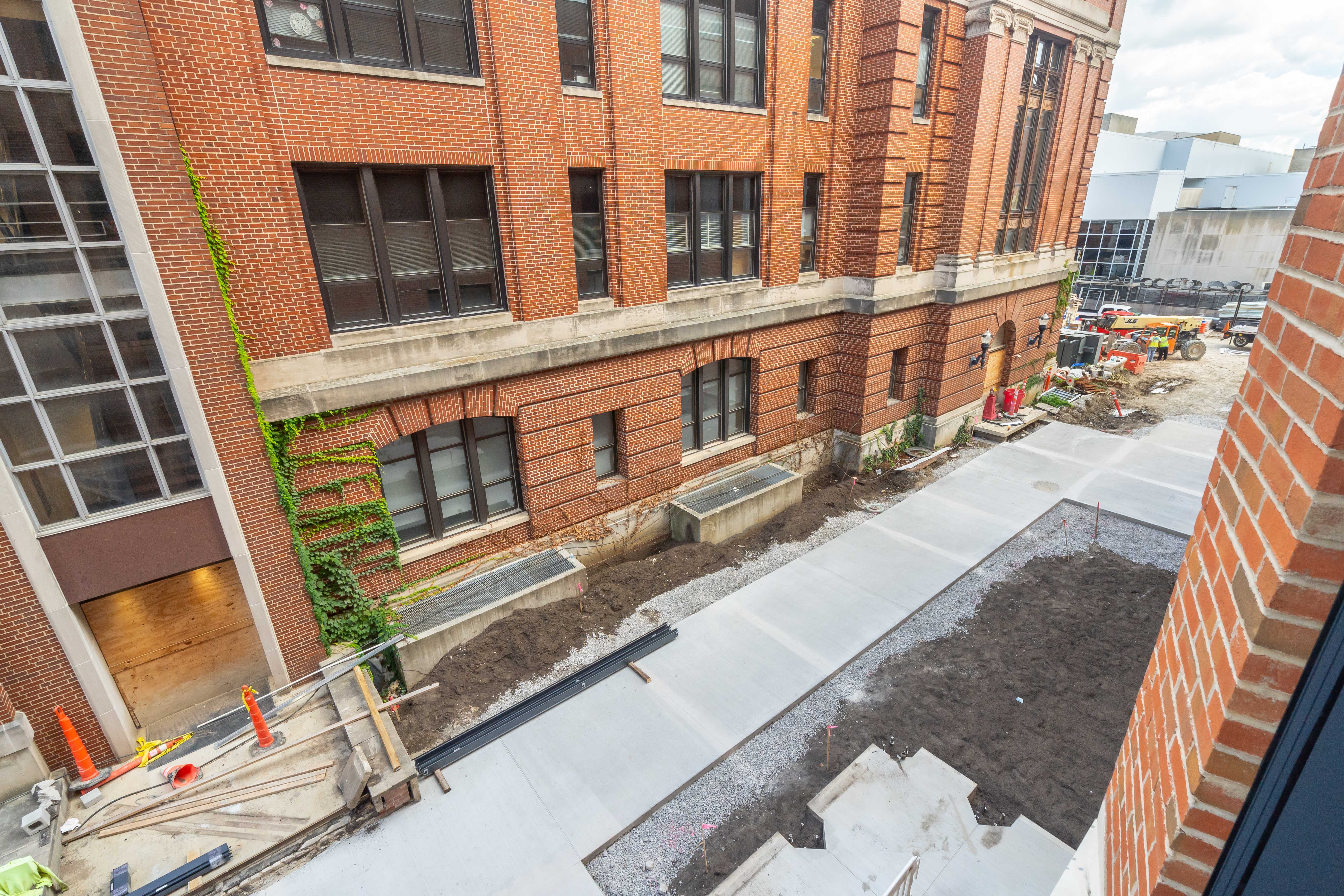 - A sidewalk is being placed on the east side of the building while exterior planter granite installation also occurs.
