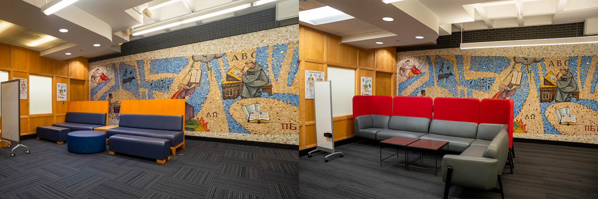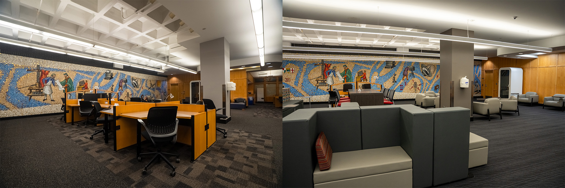 “We’re proud of the fact that we modernized the space while also maintaining the mural as the focal point,” said Erika Losey, facilities operations analyst and the Health Sciences Library’s renovation lead for the project. “We made sure the renovation complemented the mural rather than detracted from it.”