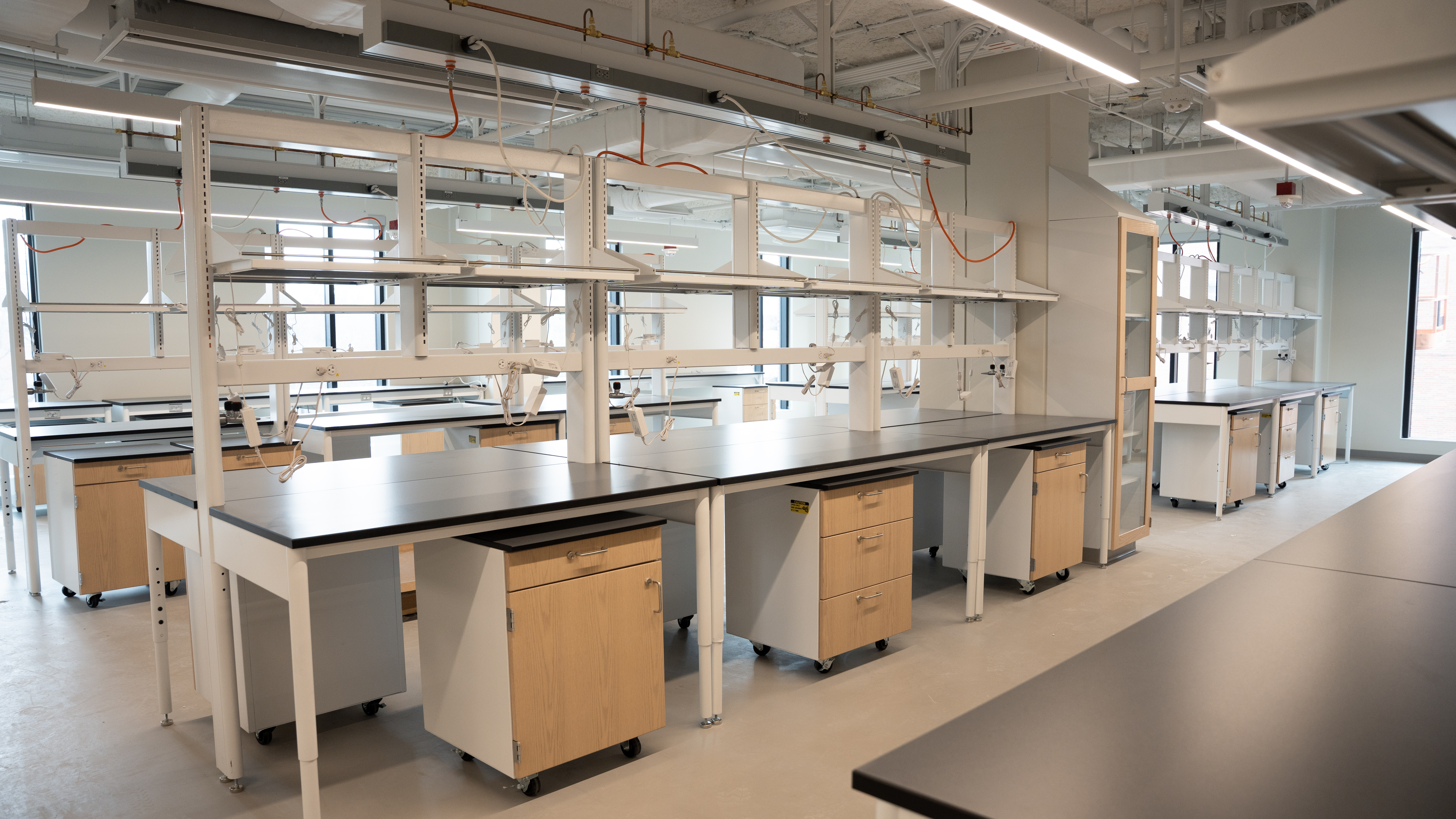 As furniture is installed, durable lab casework constructed of metal materials, complemented by wood‑style drawer and door fronts, is being used in laboratories for equipment storage.